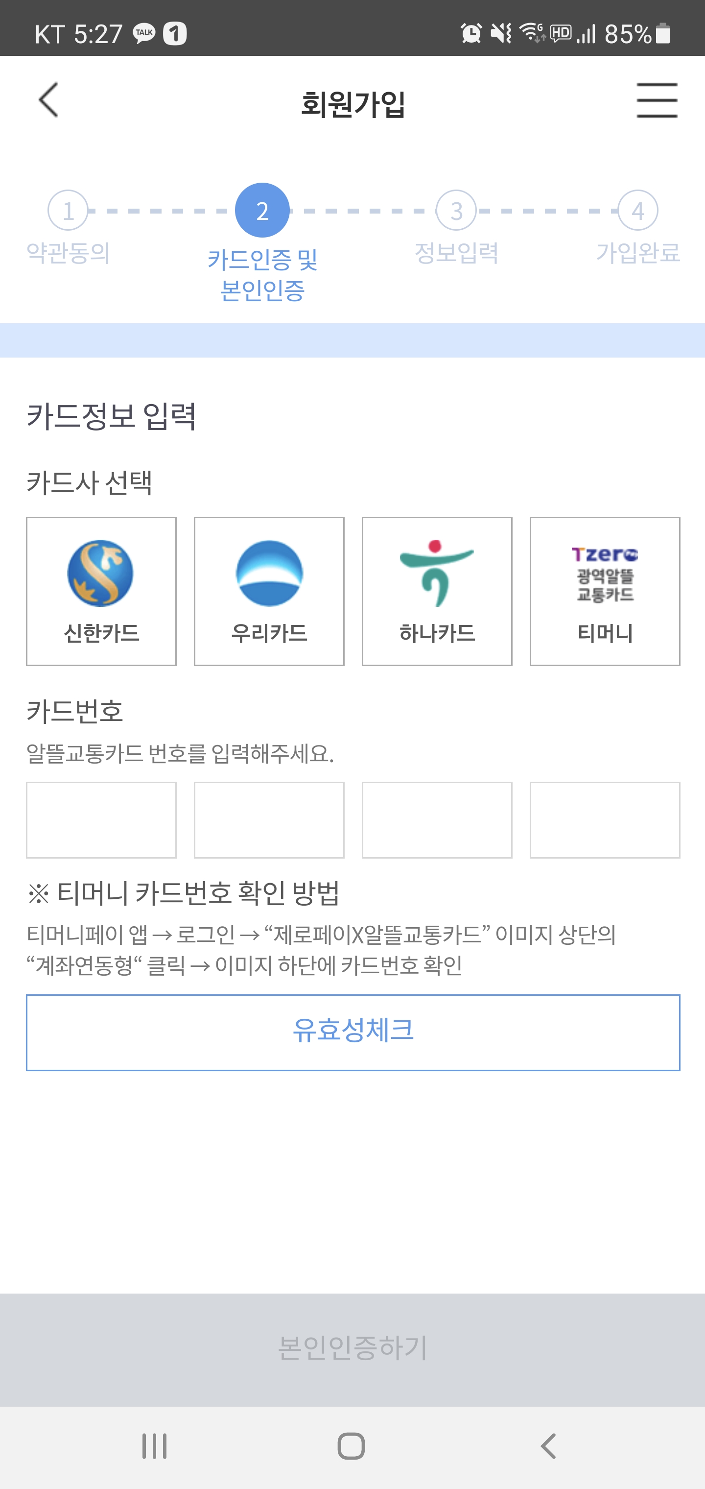 앱 실행 후 회원가입을 진행해 줍니다. 광역 알뜰교통카드로 발급받으신 카드는 꼭 등록해 주셔야 혜택을 받을 수 있는데요. 이 때문에 꼭 카드를 수령하시고 이에 걸맞은 정보를 회원 가입란에 꼭 입력 후 사용하시길 바랍니다.
