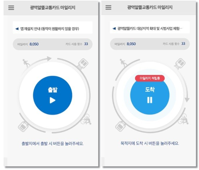 자 이제 혜택을 받아 볼까요? 예를 들어 광역 알뜰교통카드는 집에서 출발할 때 > 버스 정류장까지 걸어가는 시간에 꼭 앱에 출발 버튼을 눌러줍니다. 그리고 도착해서는 도착 버튼을 꼭 눌러 주셔야 포인트 적립이 완료가 돼요.반대로 버스정류장 > 집 도착에도 동일한 방법으로 실행하시면 포인트 적립이 되니 꼭 실행하기 바랍니다.