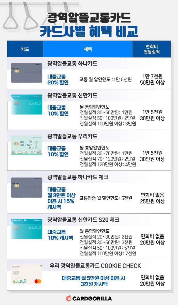 우선 광역 알뜰교통카드를 사용하시려면 카드 발급을 하여야 하는데요. 각 카드별 실적 대비 할인율 연회비를 참고하여 마음에 드는 것을 신청해 봅시다!