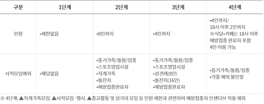 1) 사적 모임 18시 이전 4인 18시 이후 2인까지 허용