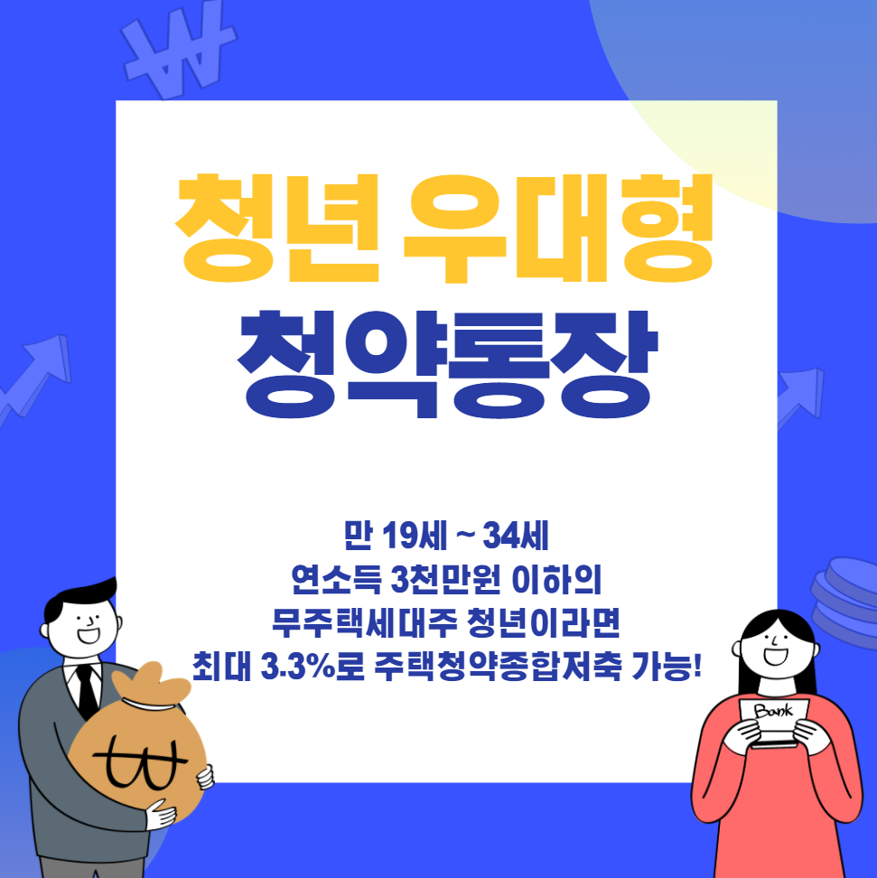 청년 우대형 청약통장은 만 19세 이상 ~ 만 34세 이하 연 3천만 원 이하의 소득이 있는 무주택